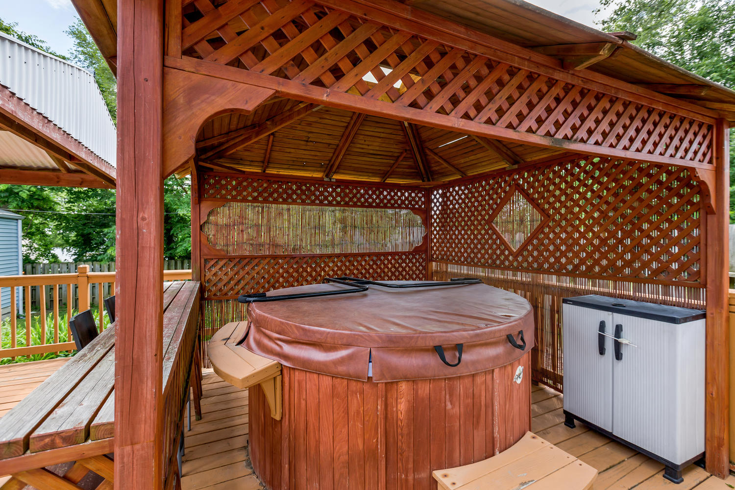 Outside, don’t forget the covered front porch, or the entertainment possibilities with your deck and hot tub. And, if you stand in just the right place, you’ll can glimpse Ford Lake! 😉