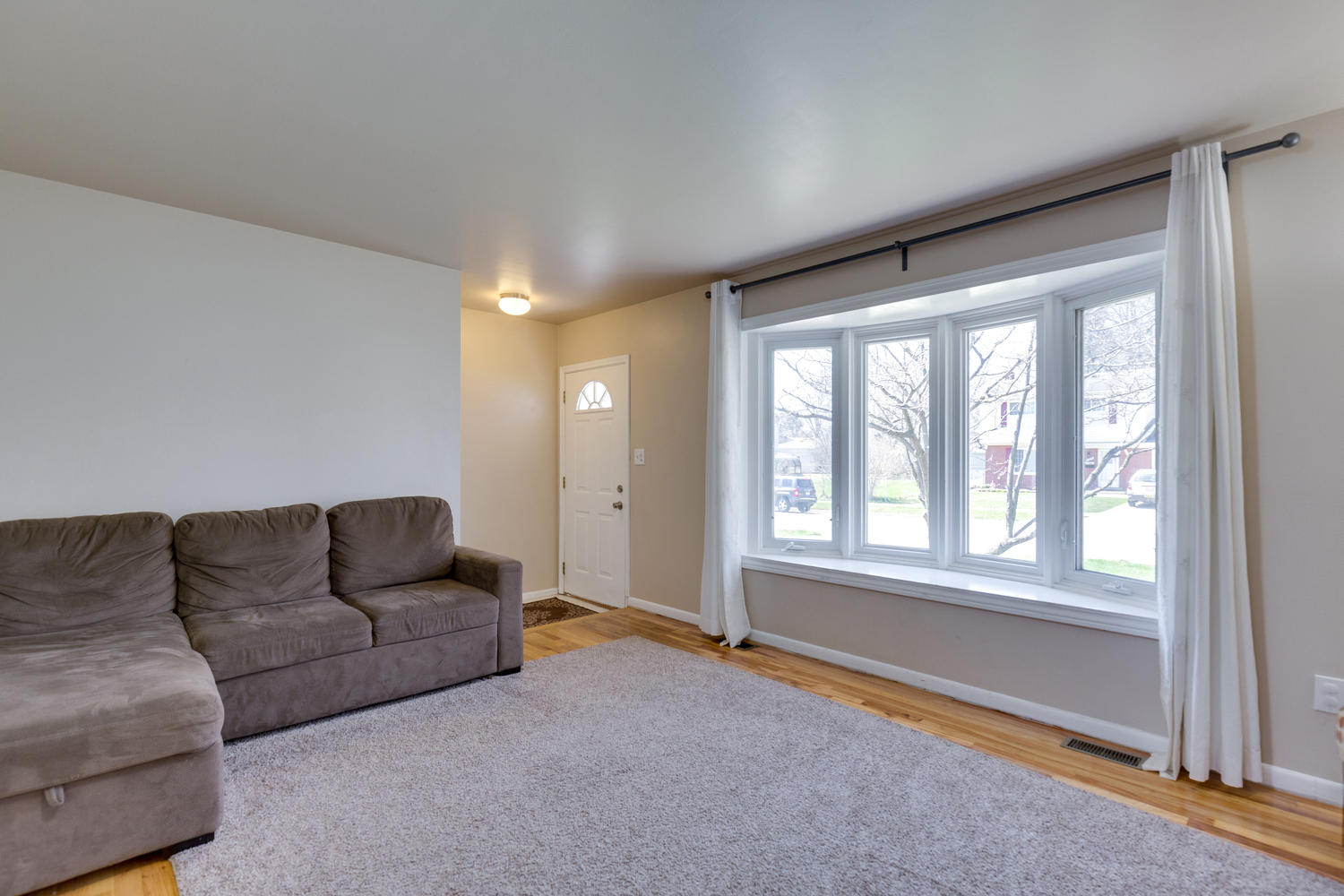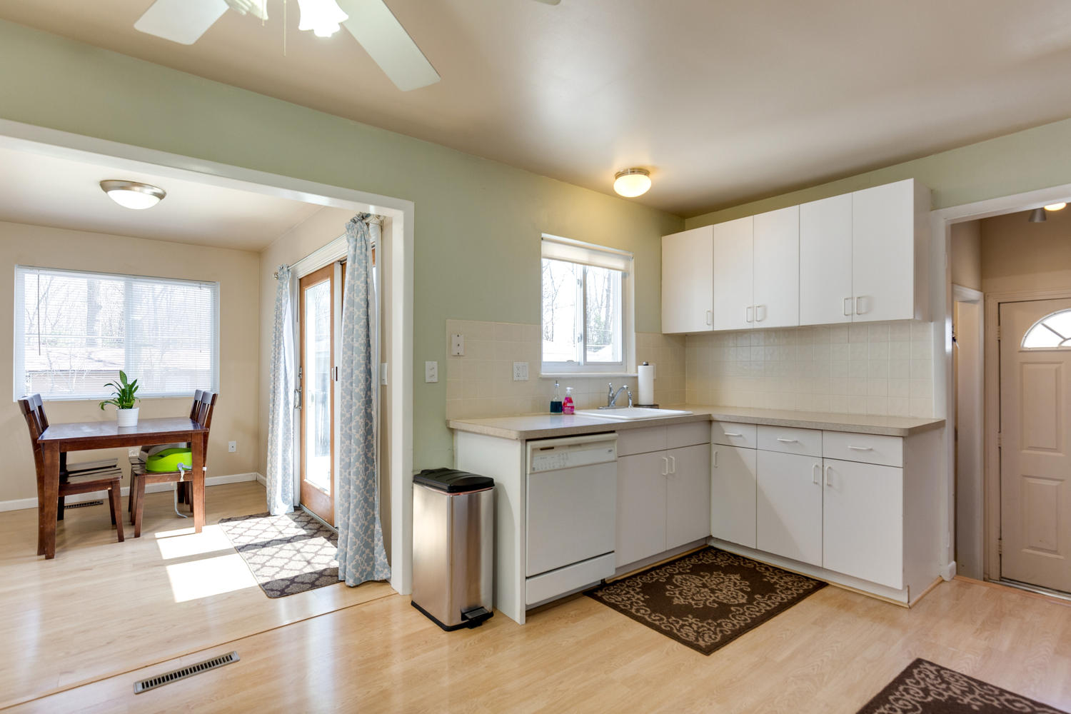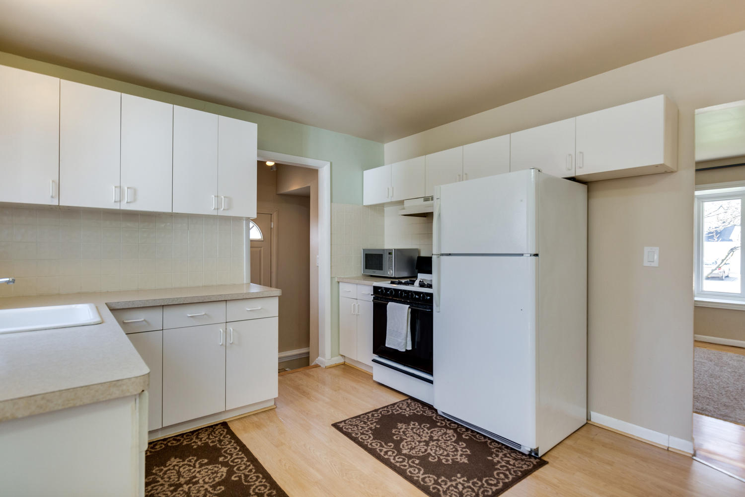 Upon entering this home, hardwood floors greet you and draw you into this home. The living room features a large view out window onto the front yard. The kitchen flows into a generously sized eat-in space. Many cabinets and generous countertops give you plenty of storage and usable surface in this kitchen.