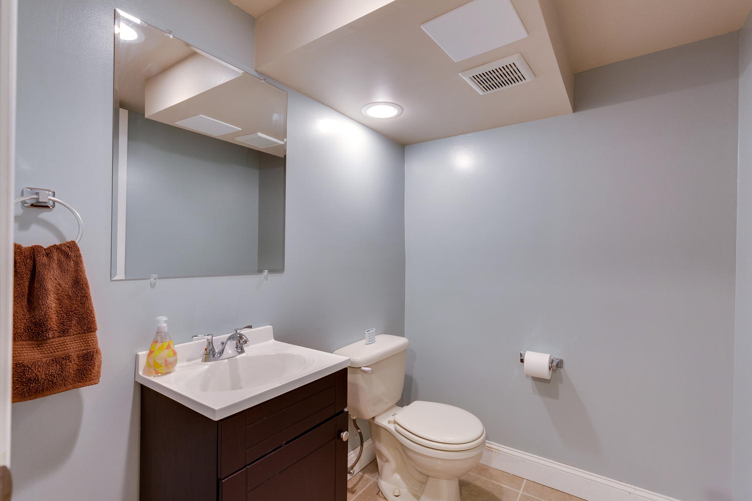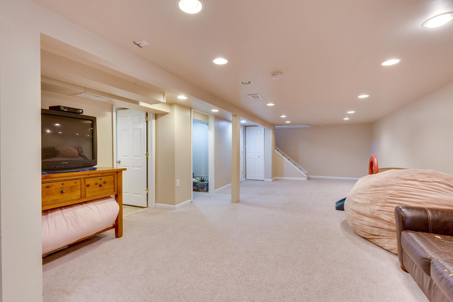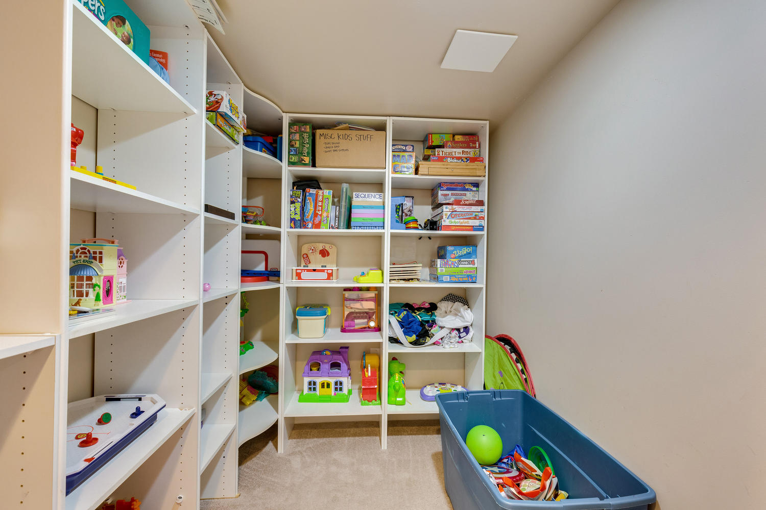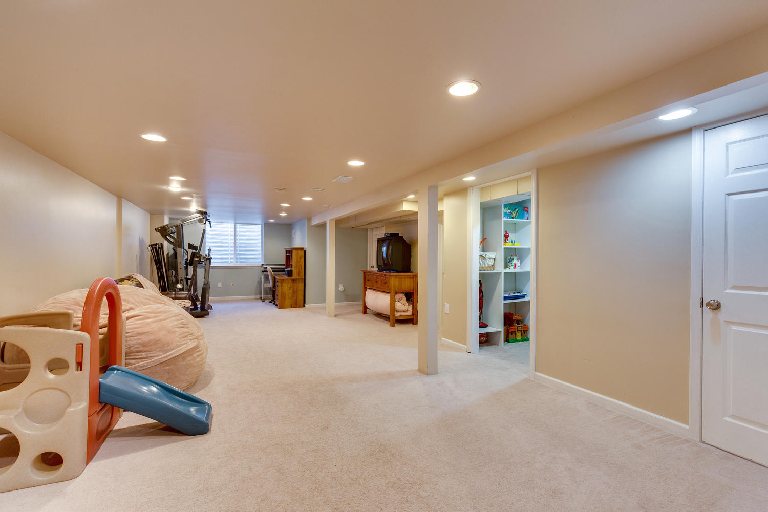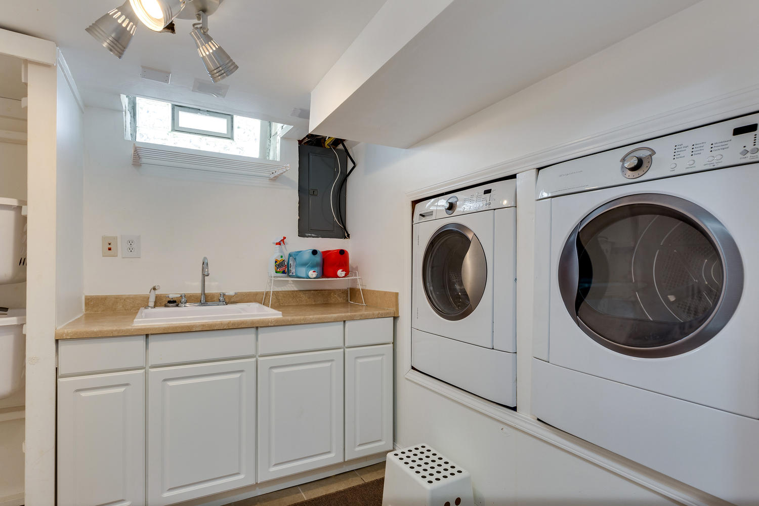 The finished space downstairs features a half bath, and a laundry room with built in space for the washer and dryer. This space can easily be set up for a home theater, home office, even a family room. Check out the extra deep closet with built in shelves!
