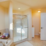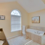 This relaxing and calm master suite features a tray ceiling and expansive tile master bath. The master bath features a dual vanity with granite countertop, a soaking tub, and tiled surround shower.