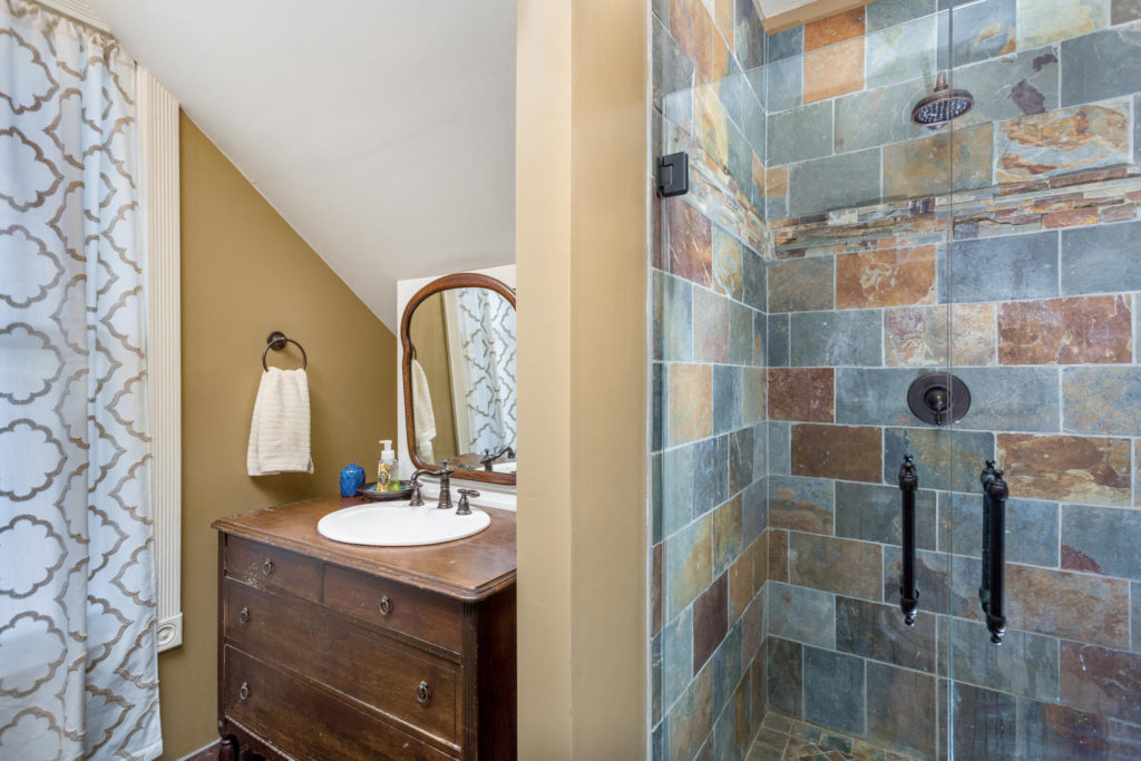 The first floor features the kitchen, dining room, family room, den, and first floor bedroom. The full bath on the first floor features a newer, slate tile surround.