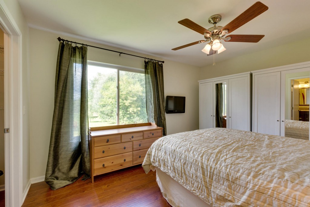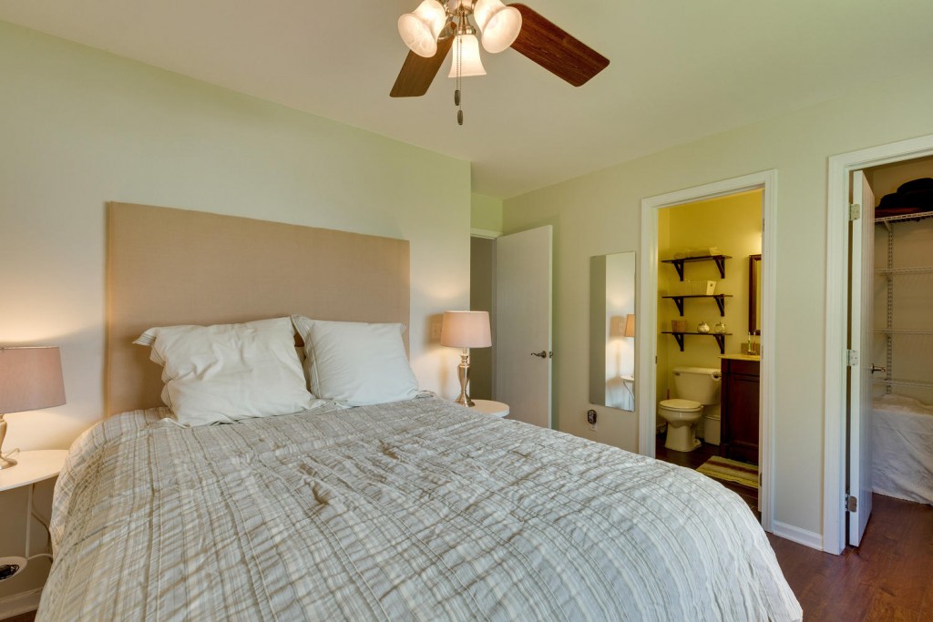 Neutral paint, coupled with the darker stained oak laminate floors draw you down the hallway to the three bedrooms. On the left is the Master Bedroom with walk-in closet and en-suite bathroom. A full bath in the hallway is easily accessible by the other two bedrooms.