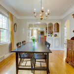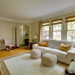 Upon entering 9625 Blackburn, you are greeted by a cozy foyer, with wet plaster walls, and slate tiled flooring. The rounded entrance opens to the stairs up or into the living room. The living room features a beautiful view-out window that drenches the interior in sunlight. The gleaming hardwood floors draw you in from the foyer, through the living room, and into the dining room. The natural, wood burning fireplace, is surrounded by built-in bookshelves and fresh mantel. The coved ceilings in the living room add a sense of intimacy to this space. Also, notice the refinished copper ventilation grates!