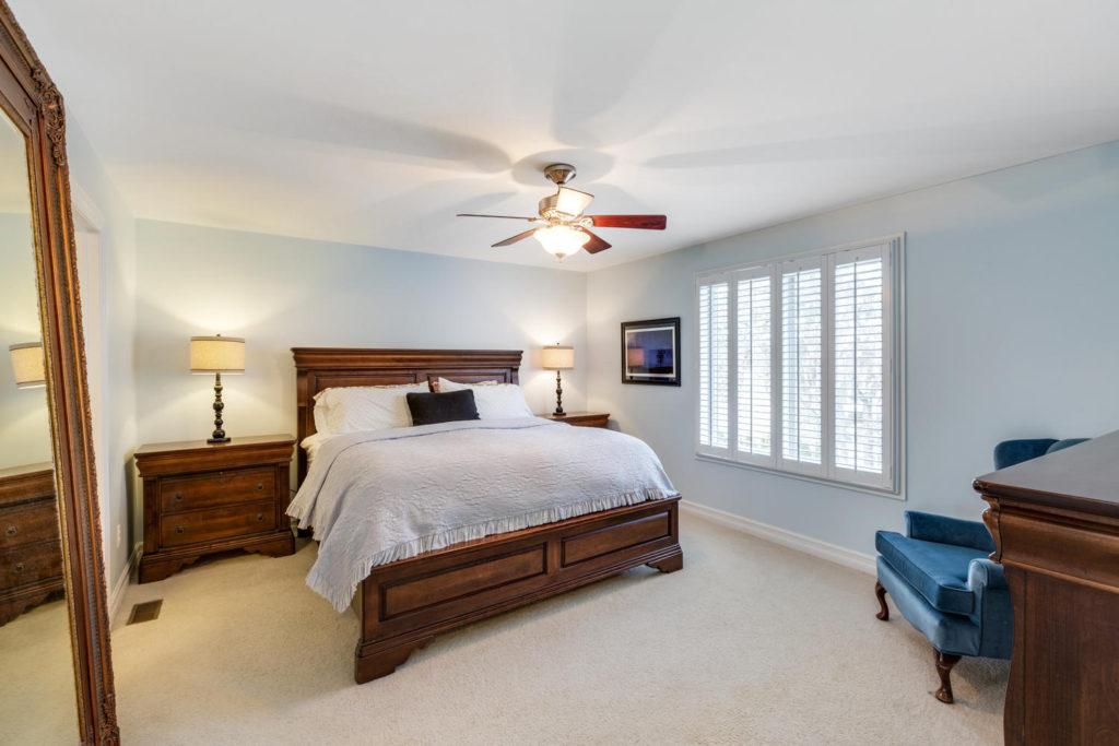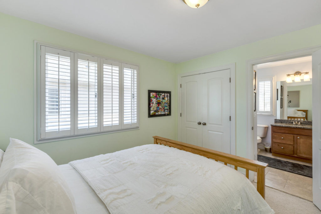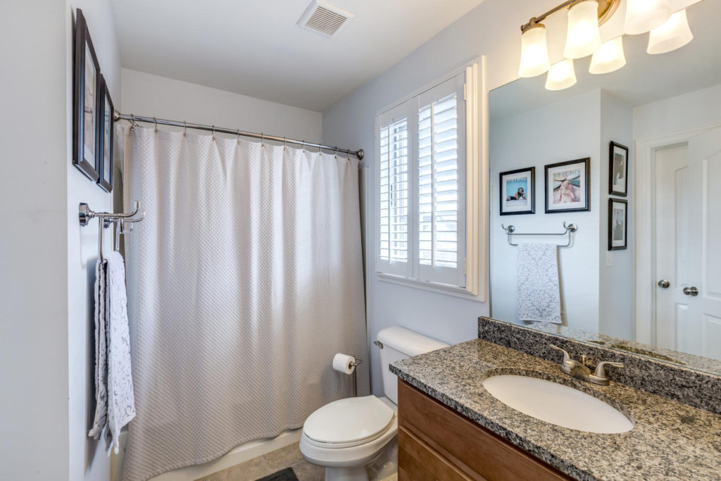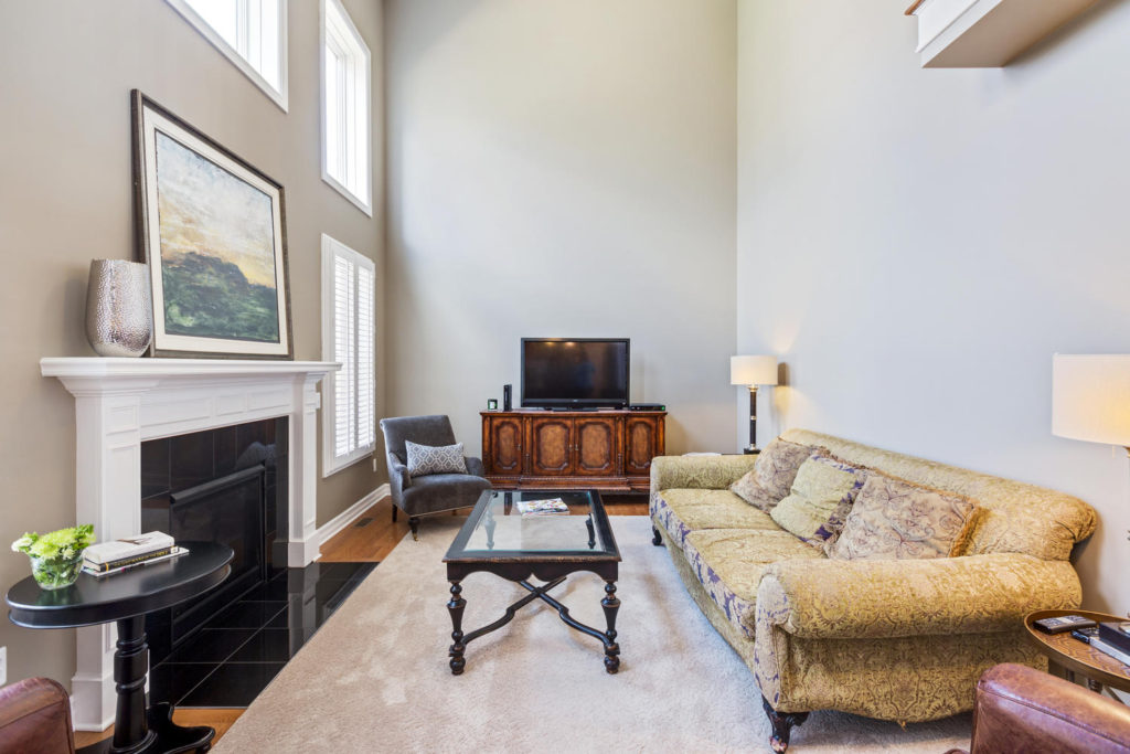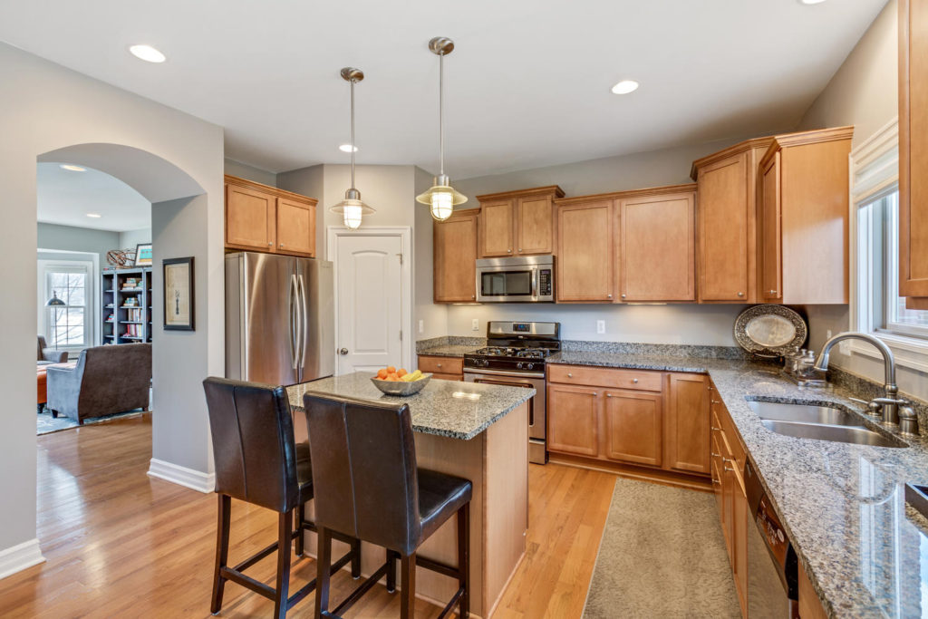 The kitchen features granite counters, 42″ cabinets, and a kitchen island that everyone will be jostling to join. The eat-in kitchen space flows seamlessly into the two-story family room. This space is further illuminated by clerestory windows and is perfect for watching a movie, or cozying up in front of the fireplace.
